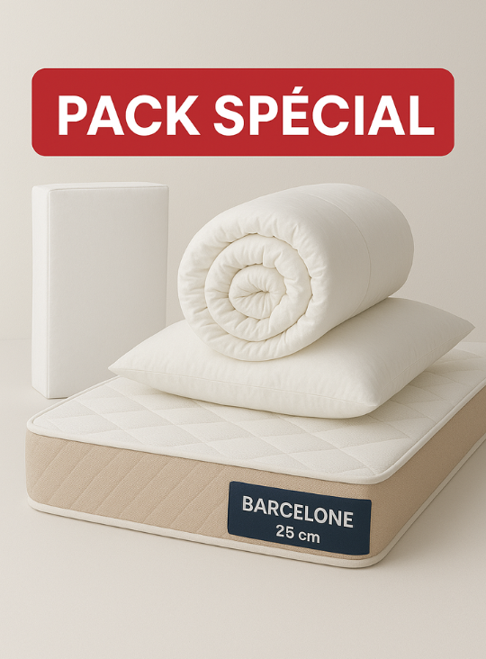 1- Matelas Barcelone 25 CM : Conçu en mousse technique haute densité 70kg/m³. Idéal pour celles et ceux qui recherchent un soutien ferme et durable.